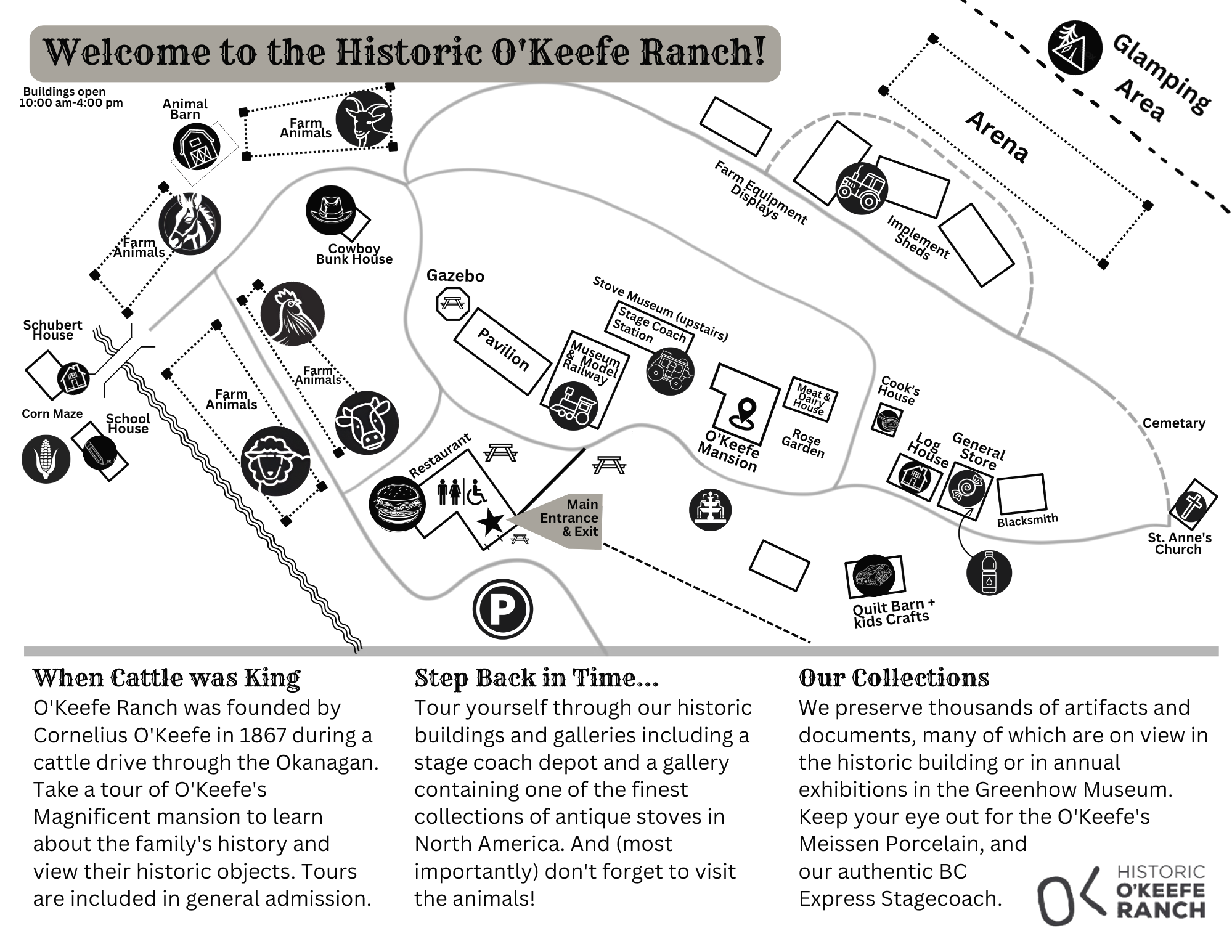 O'Keefe Ranch is a large property with lots to see, so you should be prepared to cover a lot of ground when you are here. If you wish to see the whole property, viewing all the buildings and displays and returning to the main entrance, your trip may be close to 1.2 km round trip through the Ranch. However, you can shorten your walk by bypassing the Implement Sheds up the hill.